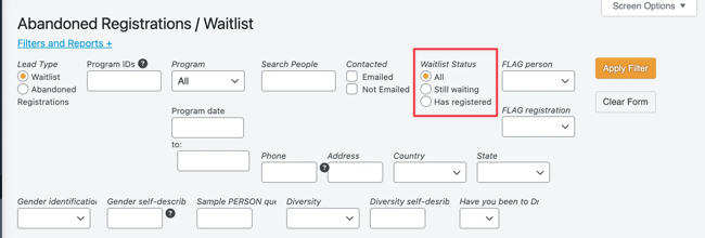 The filters available for the waitlist view have been updated to include: All, Still waiting, and Has registered.