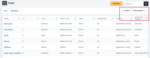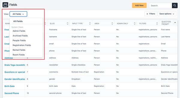 The View dropdown includes some built-in views: All Fields, Archived Fields, and filtered views by area.