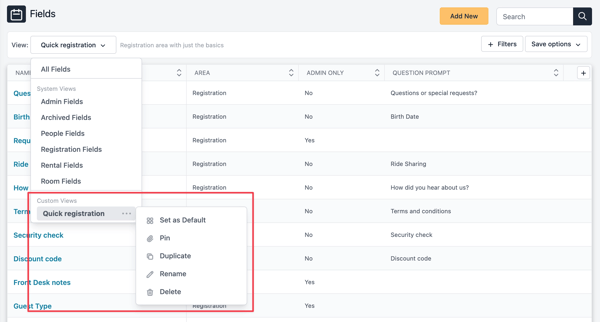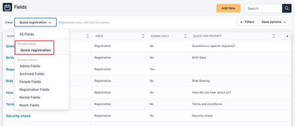 Let’s pin the Quick registration view. That view now appears in a special section in the dropdown menu for easy access.