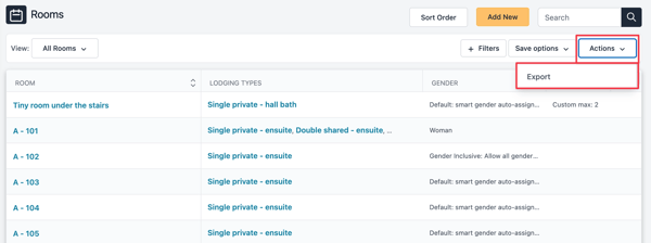 You can Export a list of Rooms, Lodging Types, Waitlist, and Leads. For example, from the Rooms view, choose Actions > Export.