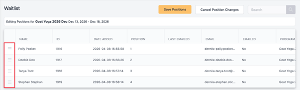 You can Edit Positions of entries on the Waitlist. From the view, choose Actions > Edit Positions and choose a program. Use the burger icon to drag and drop entries to reorder. When done, Save Positions.