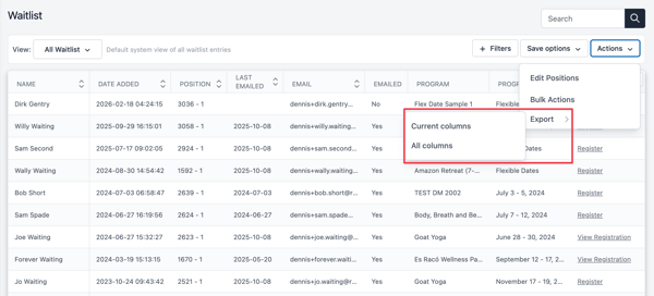 For Waitlist and Leads you can Export Current columns (those showing in the current view) or Export All columns.