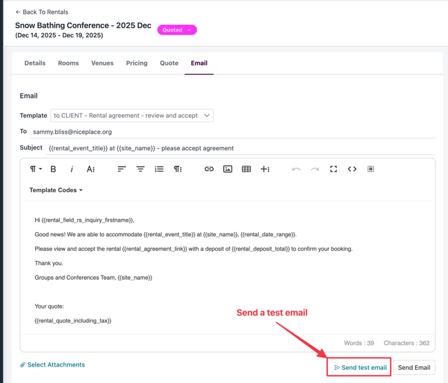 Preview your email composed in the Rental module by sending a test email. When you click on Send test email, you will be prompted to enter the address you wish to use for the test email.